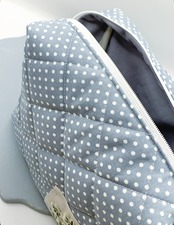 ドット柄キルト刺繍ポーチは、三輪のお花のデザインが魅力的なマチ付きの大サイズです。